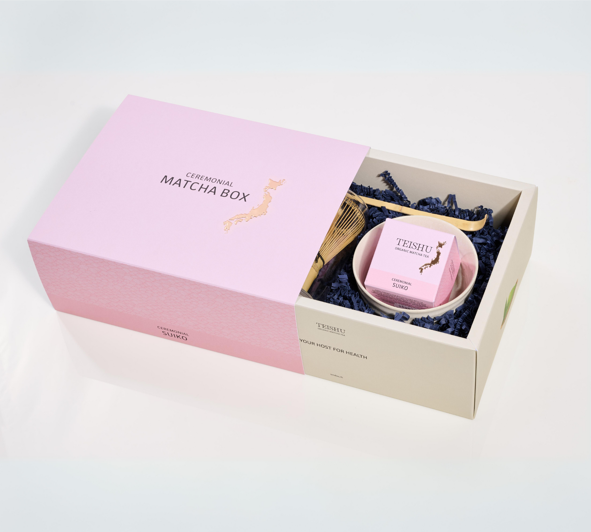 The set includes: Teishu Ceremonial Suiko Matcha ORGANIC 30g, Matcha bowl in creamy white, Matcha whisk “Chasen”, Matcha bamboo spoon “Chashaku”, Matcha preparation sheet